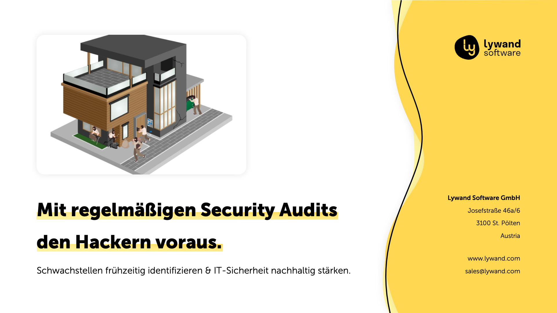 Slides im Powerpoint Format mit Informationen zu lywand (Notwendigkeit regelmäßiger Checks, Funktionen der Security Audit Plattform, Vorteile für KMUs)