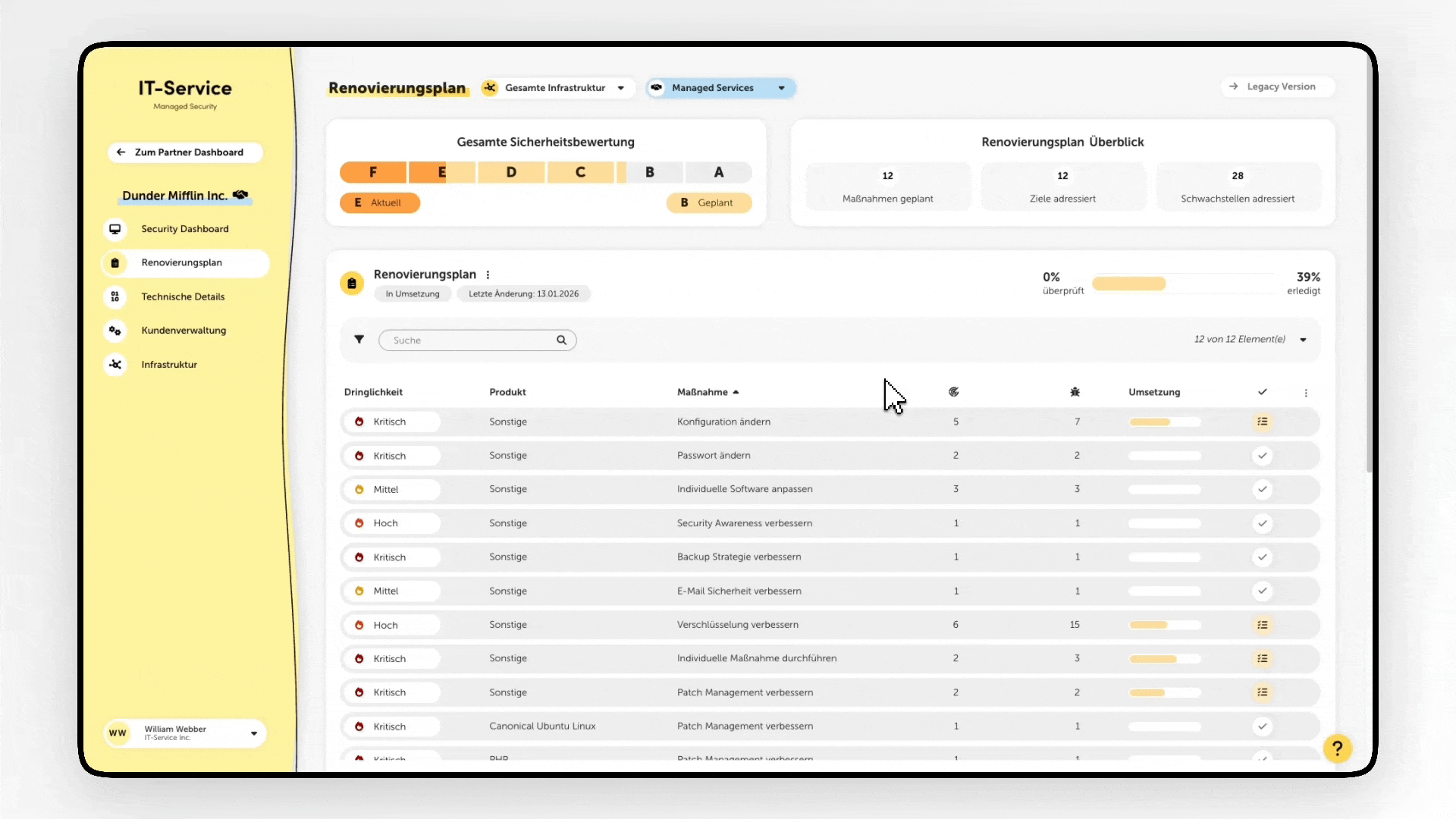 Der neue Renovierungsplan erweitert das Security Cockpit und ermöglicht erstmals eine zentrale Maßnahmenplanung auf Partnerebene sowie die Nachverfolgung der Umsetzung.