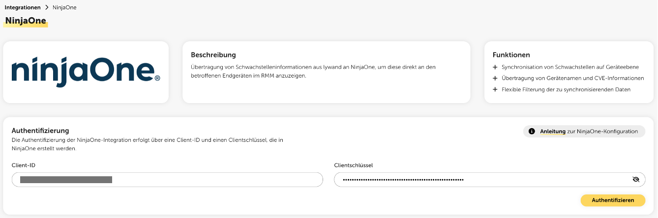 Kopieren Sie die erzeugten Authentifizierungsdaten und tragen Sie diese in Lywand bei der NinjaOne Integration ein, um die Verbindung herzustellen.