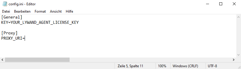 Beispiel einer config.ini mit Lizenzschlüssel und ohne Proxy-URI: