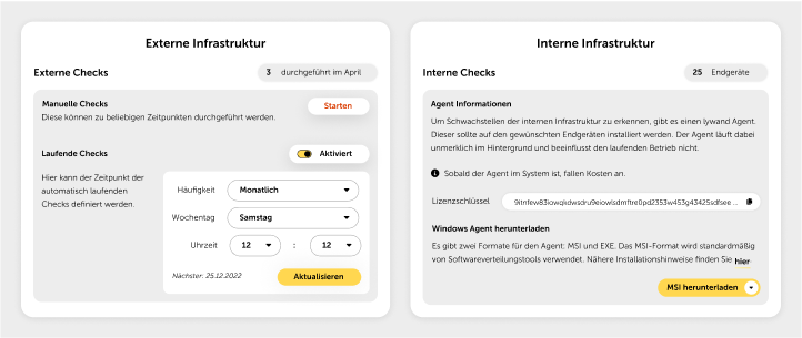 Um extern stets auf dem neuesten Stand zu bleiben, empfehlen wir Ihnen, mindestens einmal pro Monat ein automatisiertes Security Audit durchzuführen. Falls Sie Maßnahmen umgesetzt haben, schlagen wir einen zweiten Check zur Überprüfung der Wirksamkeit vor. Bei Bedarf haben Sie jederzeit die Möglichkeit, zusätzliche externe Security Audits im Menüpunkt Infrastruktur zu starten.