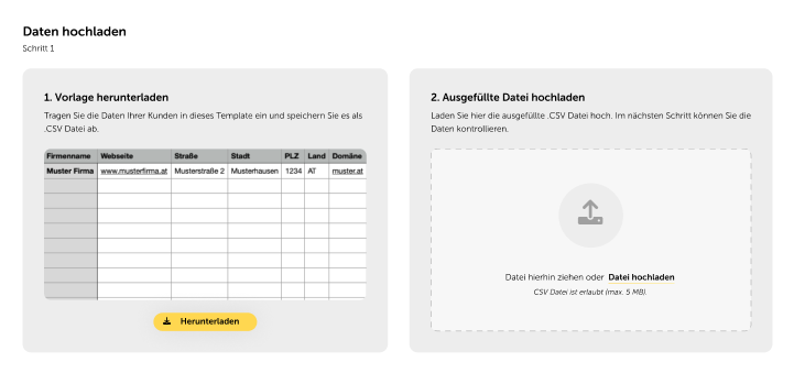 Hier brauchen Sie lediglich die Eckdaten Ihrer Kunden in ein vorgefertigtes Template einfügen und die CSV Datei hochladen.