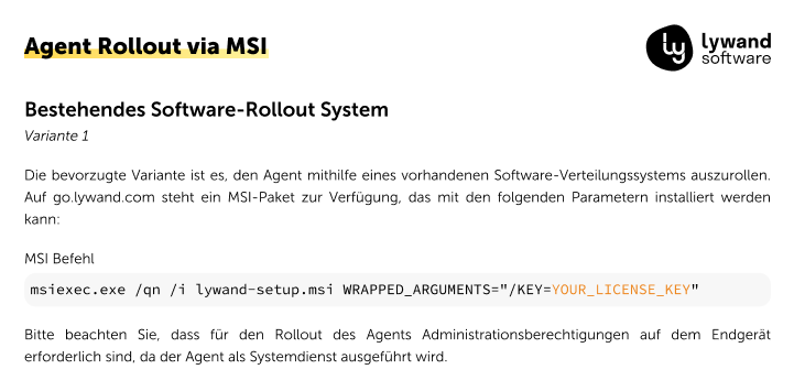 Mit einem Softwareverteilungstool Ihrer Wahl können Sie den Agent auf mehreren Endgeräten ganz einfach gleichzeitig installieren. Nähere Informationen dazu finden Sie in der Agent Rollout Anleitung.