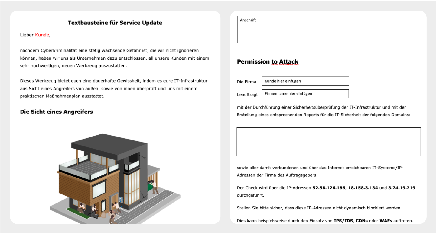 Je nach Servicetiefe kann es sein, dass Sie noch die Erlaubnis zur Überprüfung Ihrer Kunden benötigen. Hierfür steht Ihnen unsere Vorlage Permission to Attack zur Verfügung.