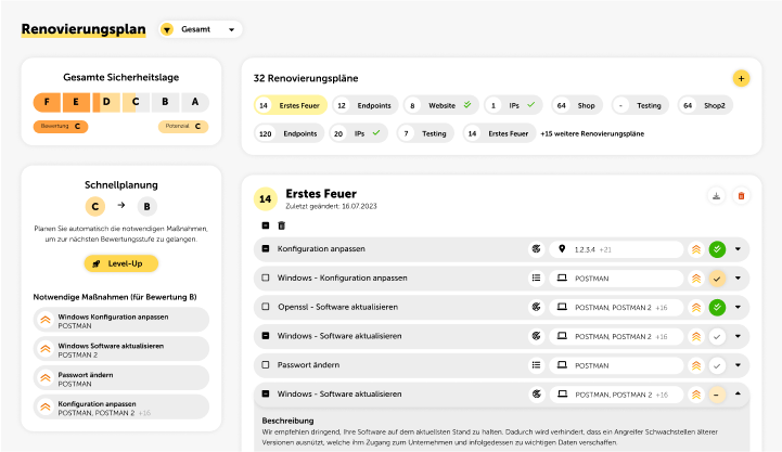 Um die Planung von Maßnahmen noch weiter zu vereinfachen, können Sie sich mit mehreren Renovierungsplänen organisieren. Hier ein paar Beispiele: Gruppierung nach Bewertung (z.B.: alle Maßnahmen um auf E zu gelangen), Ziel, Zieltyp, Zeit, Ort oder Abteilung.