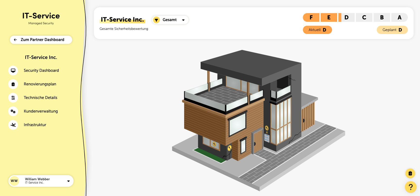 Zur einfachen Kommunikation mit Ihren Kunden haben wir eine Hausanalogie entwickelt. Es handelt sich hierbei um eine grafisch aufbereitete Darstellung der Sicherheitslage, die über den “Visualisieren” Button im Security Dashboard angezeigt werden kann. Mithilfe der Abbildung eines Hauses wird die aktuelle Sicherheitslage des Unternehmens bildlich dargestellt.