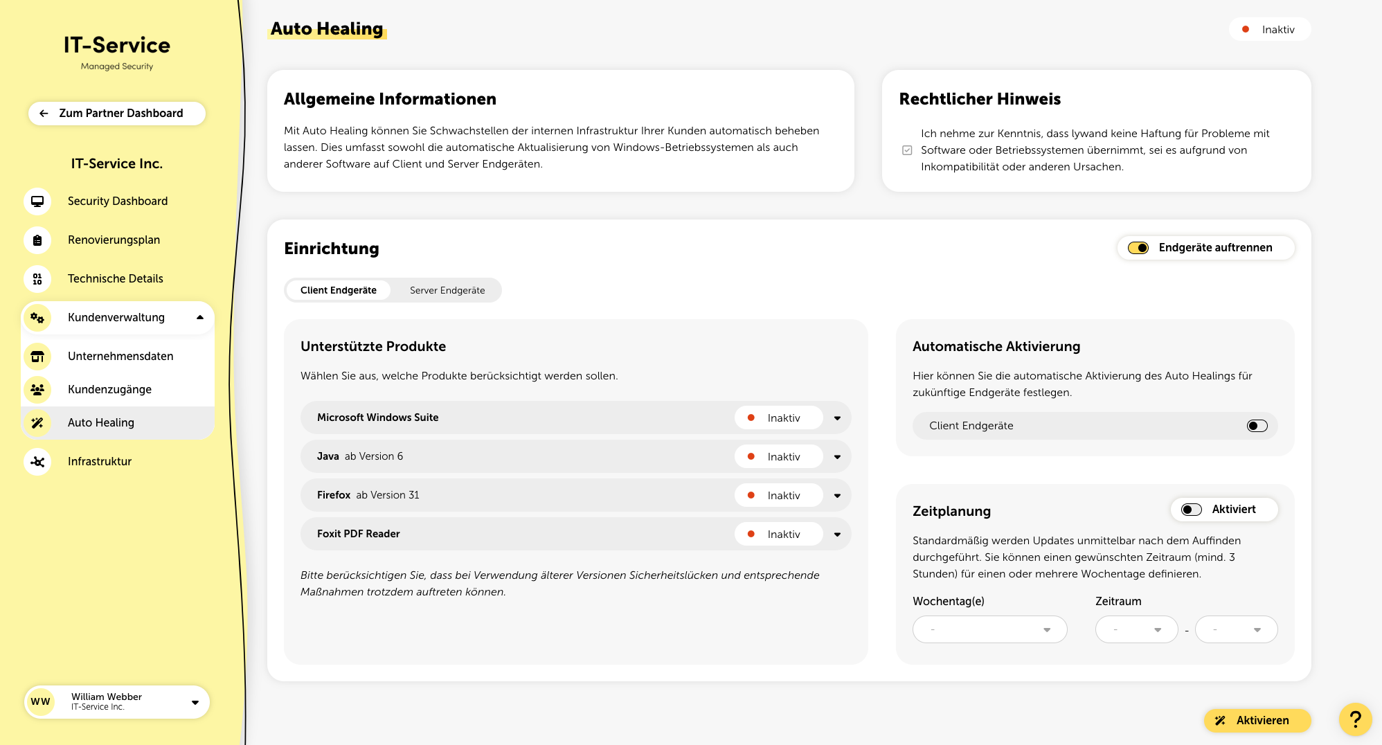 Auto Healing kann für jeden Kunden in der Plattform separat verwendet werden. Wechseln Sie in den jeweiligen Kunden und gehen Sie zum Menüpunkt: “Kundenverwaltung > Auto Healing”.