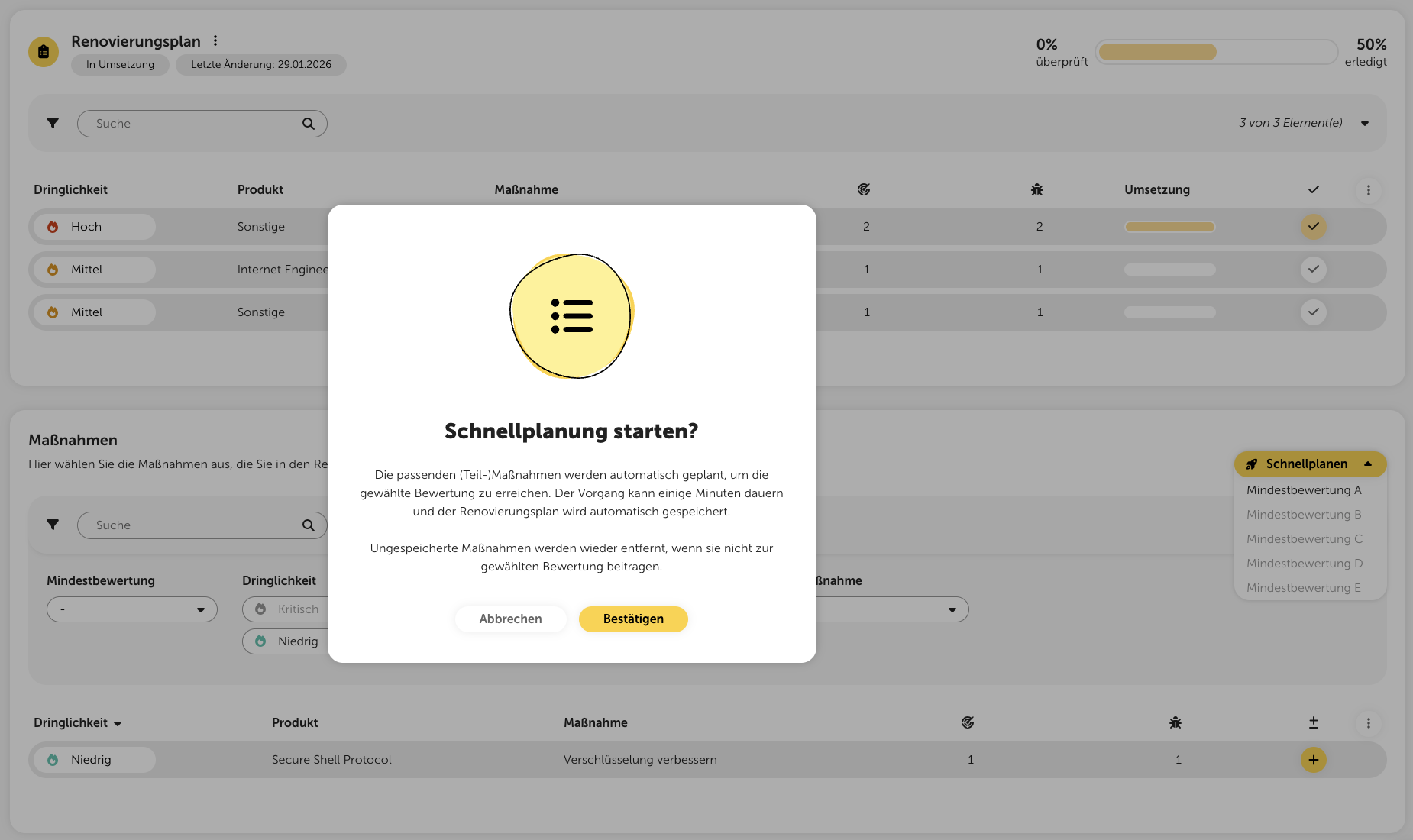 Im oberen Bereich der Maßnahmentabelle finden Sie auch die Funktion „Schnellplanen“. Damit können Sie Maßnahmen automatisch so planen lassen, dass Sie nach deren Umsetzung eine bestimmte Bewertungsstufe erreichen.