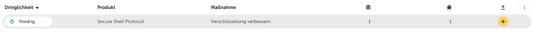 Darüber hinaus zeigt die Tabelle zu jeder Maßnahme an, wie viele Ziele betroffen sind und wie viele Schwachstellen durch die Maßnahme adressiert werden. Mit einem Klick auf die entsprechende Kennzahl werden zudem detaillierte Aufschlüsselungen dazu angezeigt.