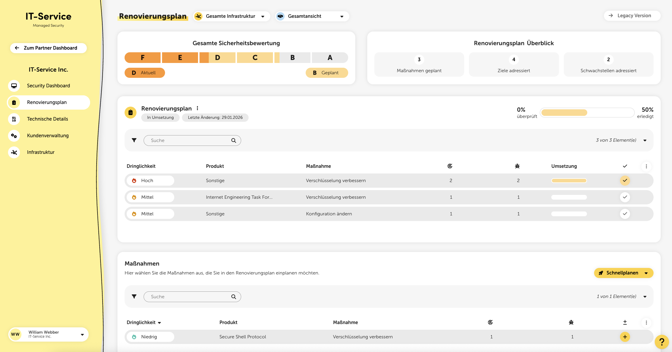 Mithilfe des Renovierungsplans können Sie Maßnahmen planen und deren Umsetzung verwalten. In diesem Menüpunkt haben Sie außerdem die Möglichkeit, mehrere Renovierungspläne anzulegen und zu bearbeiten. Unter dem derzeit gewählten Renovierungsplan finden Sie auch eine Auflistung aller verfügbaren Maßnahmen. Im Gegensatz zum Renovierungsplan im Security Cockpit können hier nur Renovierungspläne und Maßnahmen des aktuellen Kunden verwaltet werden.