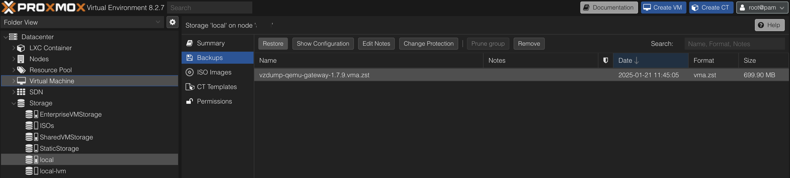 scp vzdump-qemu-gateway-1.7.9.vma.zst <PROXMOX_USER>@<PROXMOX_SERVER>:/var/lib/vz/dump/2) Proxmox Web-Oberfläche öffnen und zum Backup Speicher navigieren