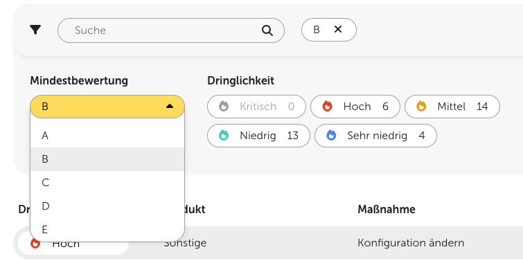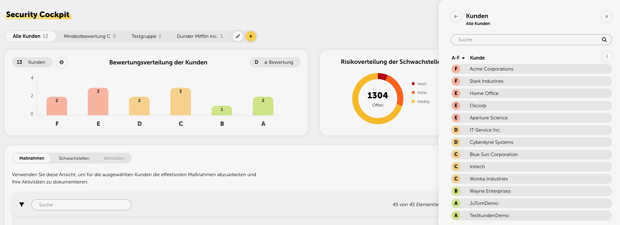 Die Tabelle mit den Maßnahmenempfehlungen ist zusammen mit dem Renovierungsplan das zentrale Feature des Security Cockpits. Hier finden Sie eine Auflistung aller Maßnahmen Ihrer Kunden, die nach Dringlichkeit sortiert ist. Die Dringlichkeit errechnet sich dabei aus der Summe aller Risikowerte.