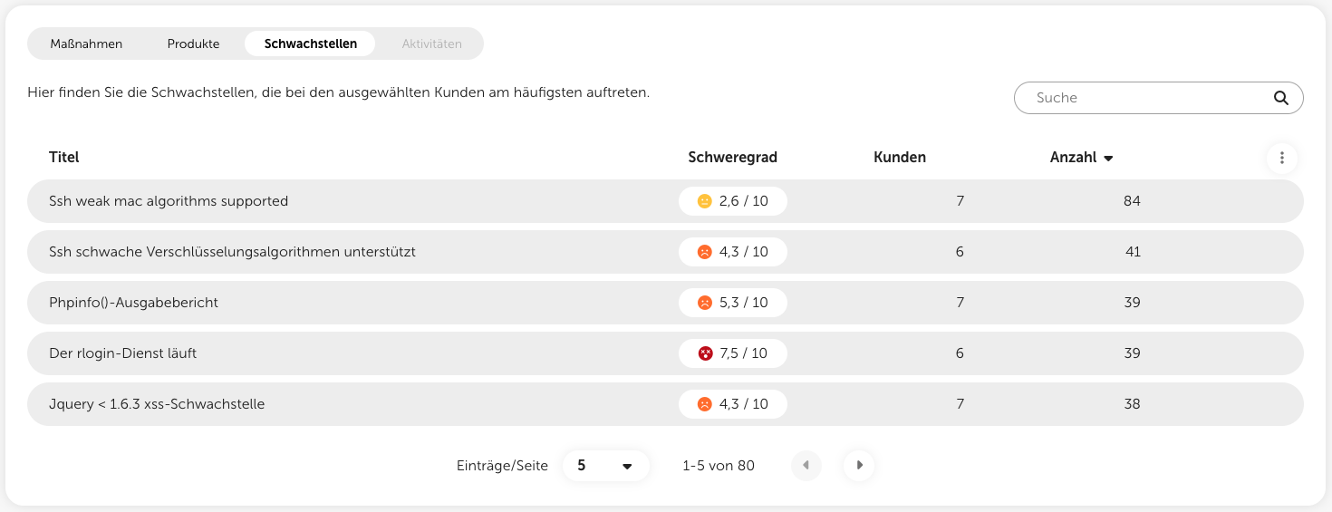 Mit einem Klick auf den Tab “Schwachstellen” gelangen Sie zu einer Auflistung der häufigsten Schwachstellen innerhalb der gewählten Kundengruppe. Auch hier können Sie auf die Metriken in einer Zeile klicken, um die Detailansicht zu öffnen und weitere Informationen dazu zu erhalten.
