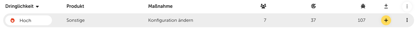 Darüber hinaus zeigt die Tabelle zu jeder Maßnahme an, wie viele Kunden und Ziele betroffen sind und wie viele Schwachstellen durch die Maßnahme adressiert werden. Mit einem Klick auf die entsprechende Kennzahl werden zudem detaillierte Aufschlüsselungen dazu angezeigt.