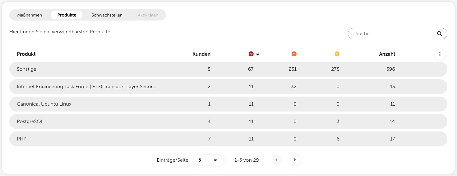 Mit einem Klick auf den Tab “Produkte” oberhalb der Tabelle gelangen Sie zu einer Auflistung der verwundbarsten Produkte innerhalb der gewählten Kundengruppe. Auch hier können Sie auf die Metriken in einer Zeile klicken, um die Detailansicht zu öffnen und weitere Informationen dazu zu erhalten.