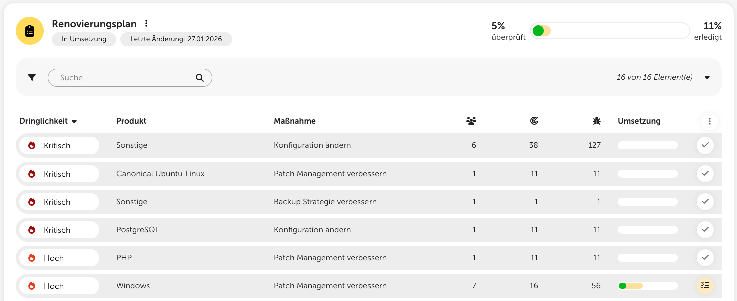 Sie können mithilfe des Security Cockpits auf einen Blick erkennen, wo vorrangiger Handlungsbedarf besteht und welche Schritte den größten Effekt zur Verbesserung Ihrer IT-Sicherheit haben. Mithilfe des Renovierungsplans lassen sich die dringendsten Maßnahmen direkt im Security Cockpit planen.