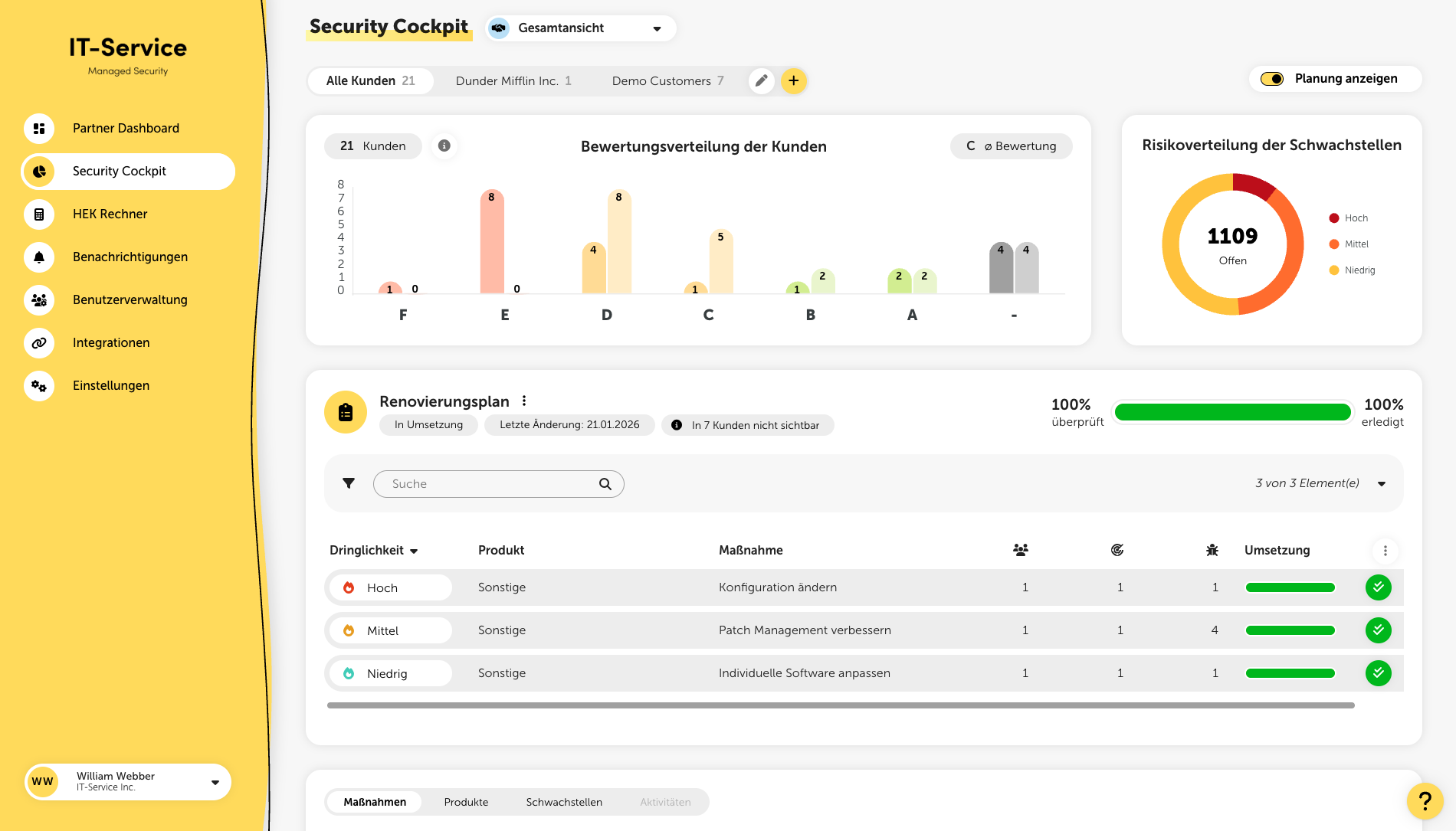 Im Security Cockpit haben Sie direkt die Möglichkeit, Maßnahmen kundenübergreifend zu planen. Mithilfe des Renovierungsplans können Sie die geplanten Maßnahmen sowie deren Umsetzungsgrad einsehen und verwalten. Sie können auch mehrere Renovierungspläne erstellen und diese verschiedenen Kunden zuordnen. Wenn Sie einen hier erstellten Renovierungsplan einem oder mehreren Kunden zuordnen, wird dieser dann im Menü “Renovierungsplan” in der jeweiligen Kundenansicht angezeigt.