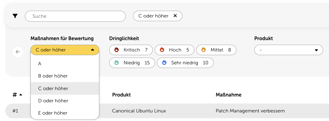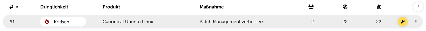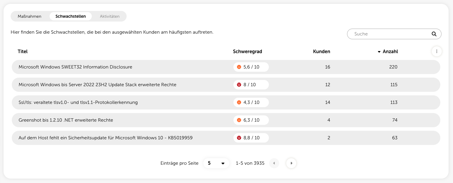 Die Tabelle mit den Maßnahmenempfehlungen stellt das zentrale Feature des Security Cockpits dar. Hier finden Sie eine Auflistung aller Maßnahmen Ihrer Kunden, sortiert nach Dringlichkeit. Die Dringlichkeit errechnet sich hierbei aus der Summer aller Risikowerte.