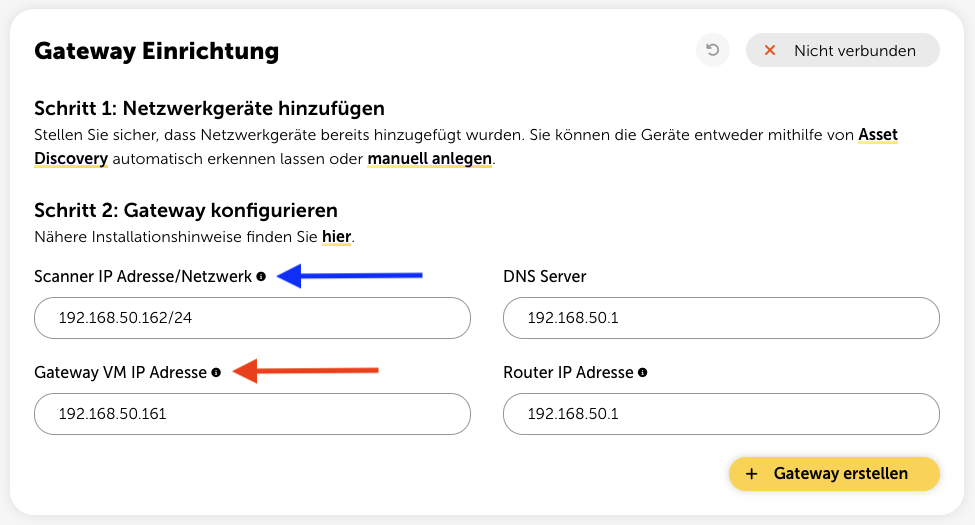 Die IP-Adresse des Scanners wird in Schritt 2 auf der Konfigurationsseite in der Plattform angegeben. Die IP-Adresse des Gateways wird hingegen direkt im Gateway konfiguriert.