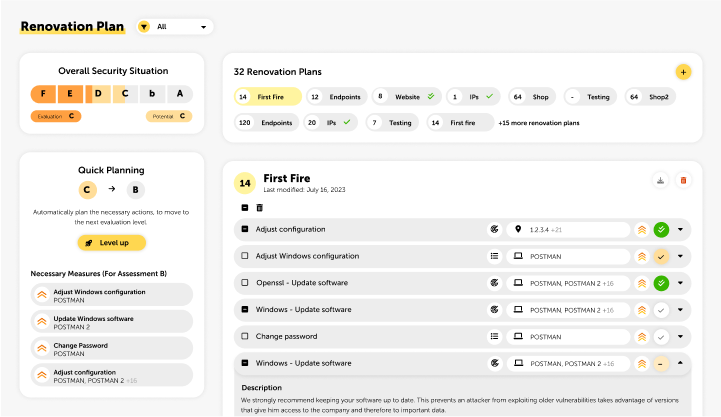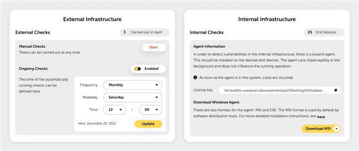 To ensure that you are always up to date externally, we recommend that you run an automated security audit at least once a month. If you have implemented measures, we suggest a second scan to check their effectiveness. If necessary, you can always initiate additional external security audits in the “Infrastructure” menu item.