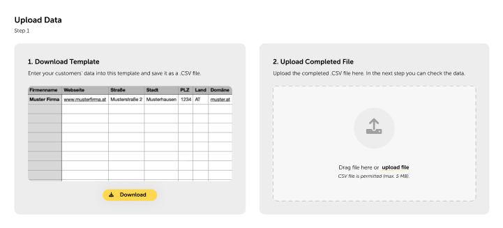 All you need to do is enter your customers' key data into a pre-designed template and upload the CSV file.