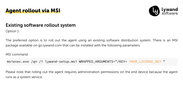 Using a software distribution tool of your choice, you can easily install the agent on multiple devices at the same time. See the Agent Rollout Guide for more information.
