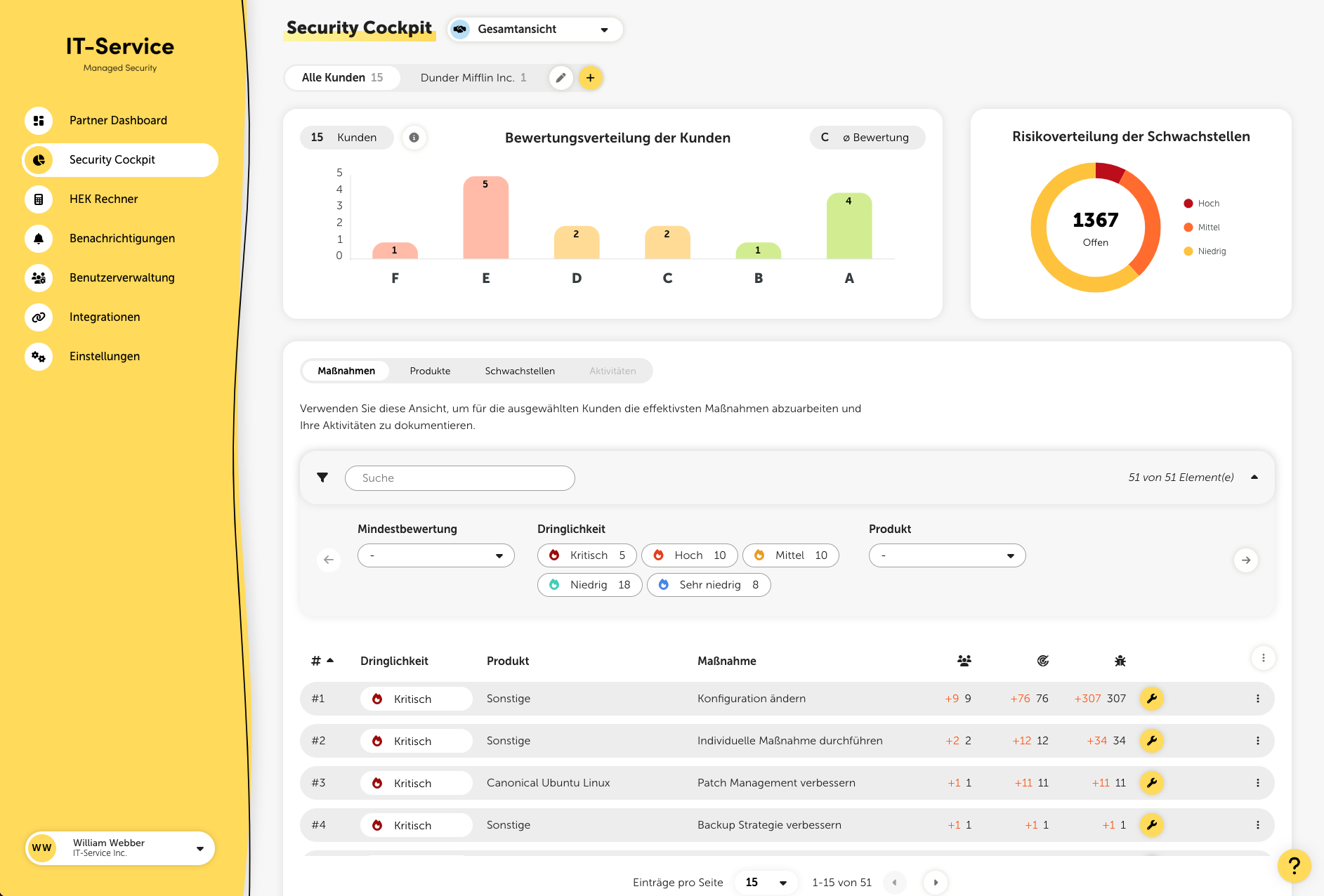 The table with recommended measures is the central feature of the Security Cockpit. Here you’ll find a list of all measures for your clients, sorted by urgency. The urgency is calculated based on the sum of all risk values.